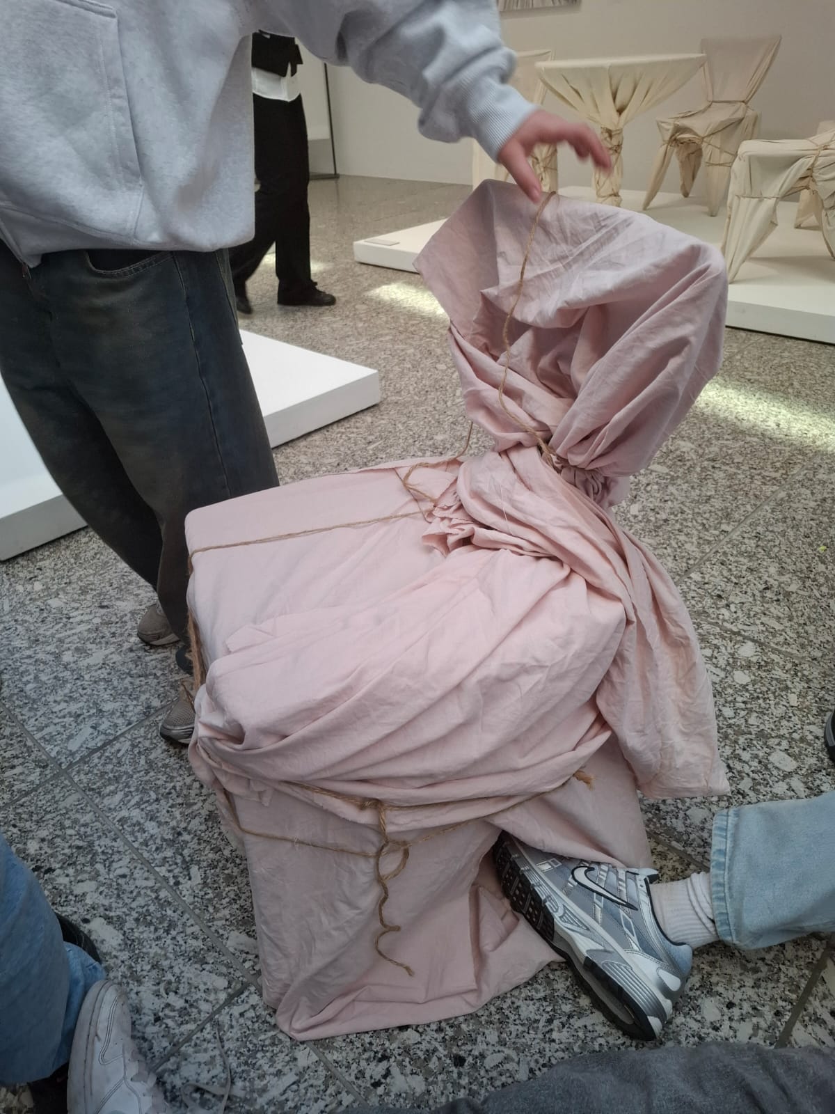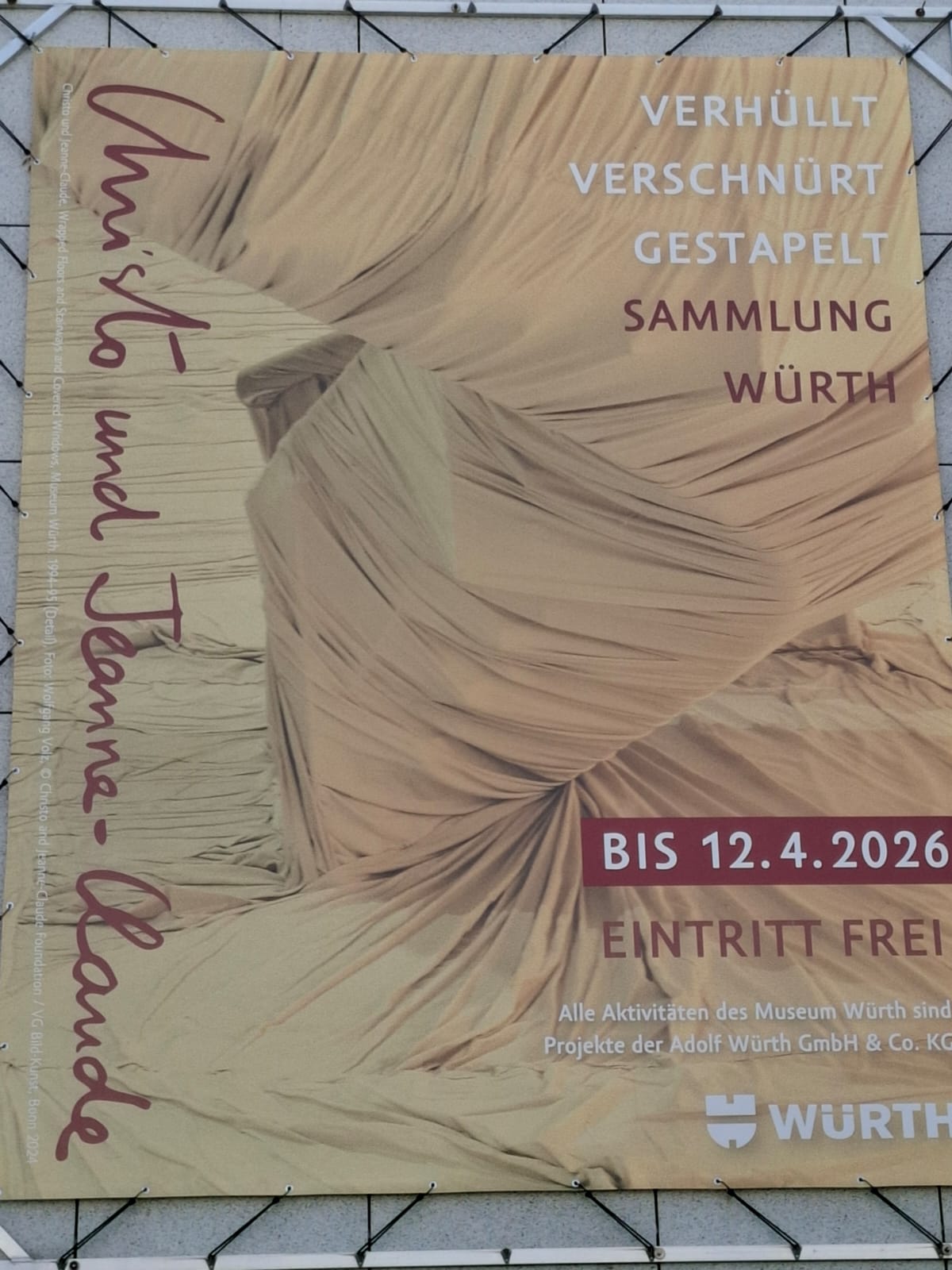 Durch Christos und Jean-Claudes beeindruckende Werke in der Ausstellung "Verhüllt.Verschnürt.Gestapelt". Ein Werk aus verpackter Luft fünf mal so hoch wie die Kletterhalle, die am Montag zuvor erklommen wurde machte mächtig Eindruck. Die Erzählungen über die Freundschaft Reinhold Würths zum Künstlerehepaar und das eigenständige Arbeiten wie Christo und Jean-Claude (siehe Bilder) rundeten die 60-minütige Führung ab. Ausgewählte Werke der einzigartigen Sammlung Würths, also 100 Arbeiten von rund 60 Künstlern aus der Sammlung Würth konnte die Klasse 8a in der Ausstelung "Focus" mit fokussiertem Blick erleben.