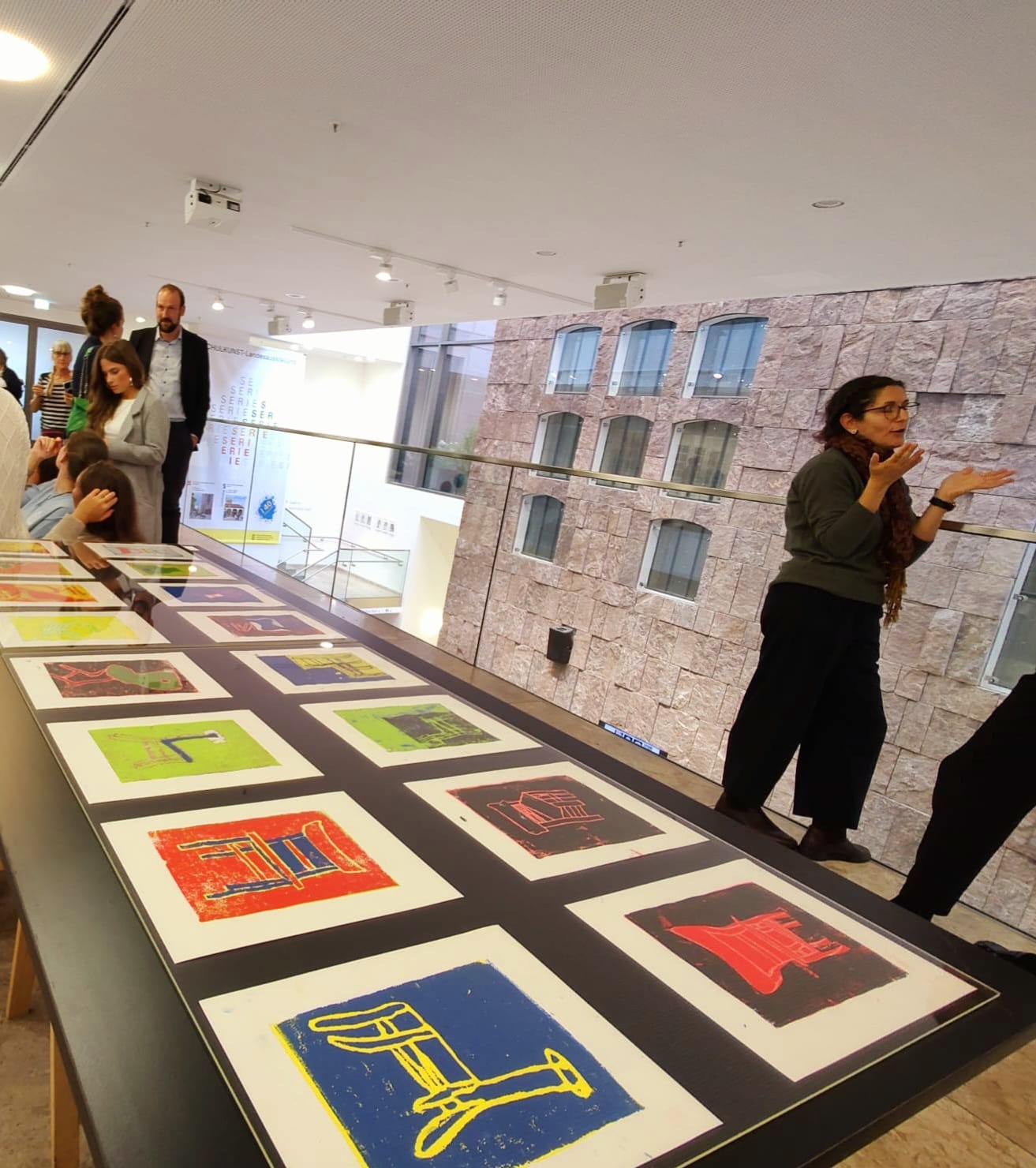 Im Oktober fand die, im zweijahres Rythmus, stattfindende Landesausstellung der SCHULKUNST in Stuttgart statt. Dieses Jahr sogar zum 40. Mal! Auch die Realschule Osterburken hat sich intensiv mit dem Thema "Serie" auseinandergesetzt und in verschiedenen Klassenstufen, Techniken und Themen viele Werke geschaffen. Ausgewählte Arbeiten wurden auch schon in Buchen im Frühsommer bei der regionalen SCHULKUNST-Ausstellung gezeigt. Für die Landesausstellung wurden die "Stühle" (Technik: Drucken) der damaligen Klasse 7c (Schuljahr 24/25) ausgewählt. Diese mehrfarbigen und mehrschichtigen Styropordrucke wurden auf einem Tisch liegend unter einer Glasplatte ansprechend präsentiert.